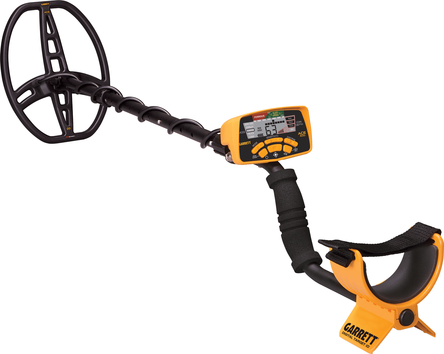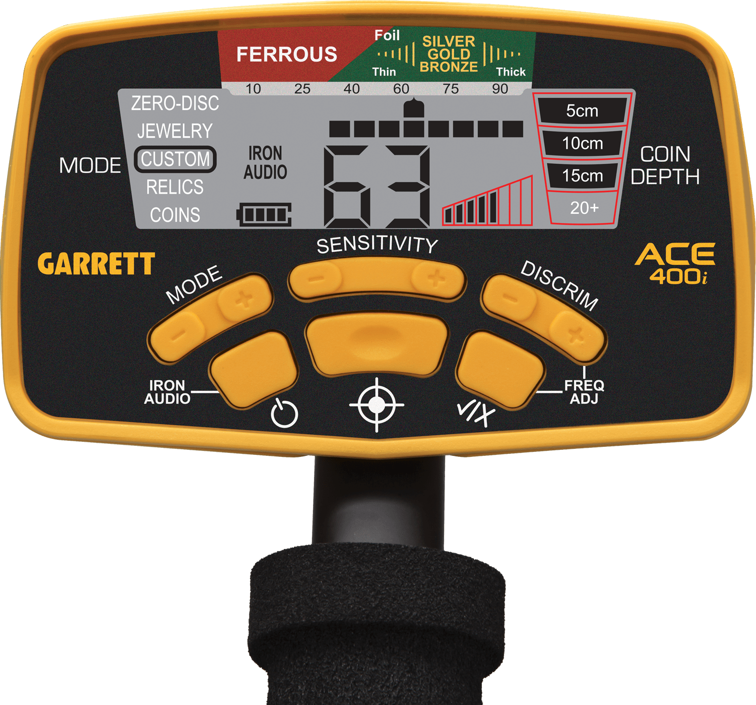 Wykrywacz ACE 400i, najwyższy model serii Ace, posiada takie funkcje jak Sygnalizację dźwiękową żelaza, Identyfikację cyfrową znaleziska oraz regulowaną częstotliwość pracy, które przyczynią się do szybszego odnajdywania ukrytych przedmiotów.