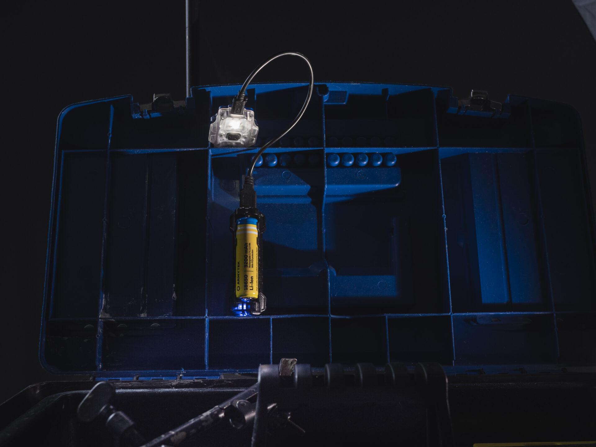 - Wbudowany akumulator Li-Pol 600 mAh ładuje się dowolnym kablem USB-C.