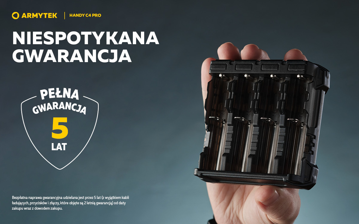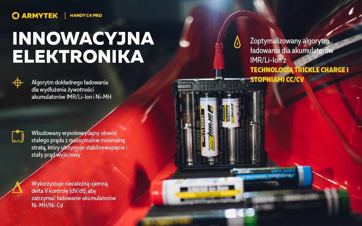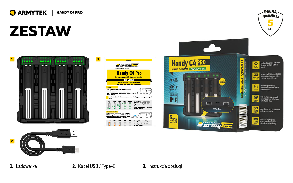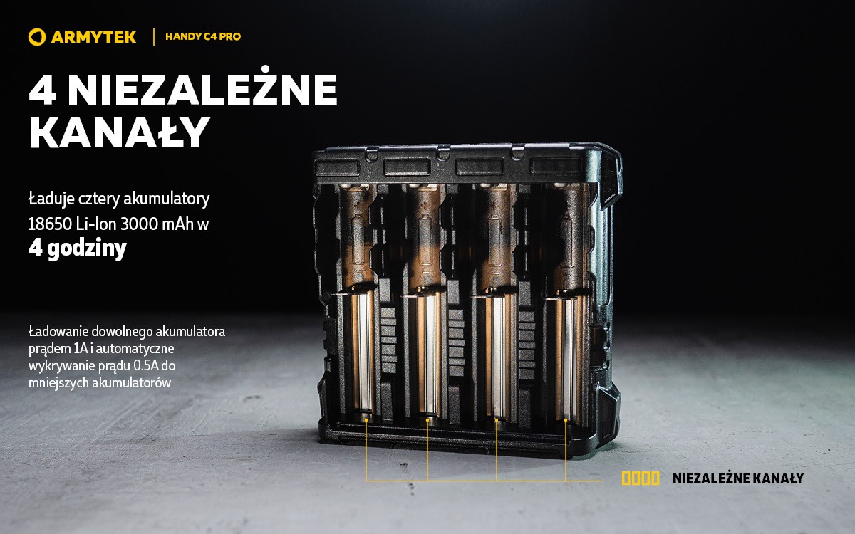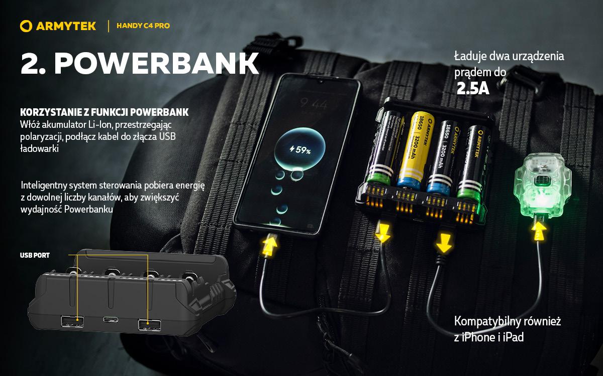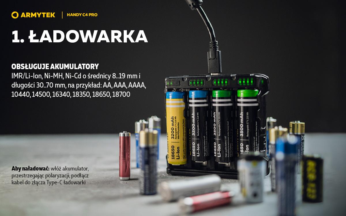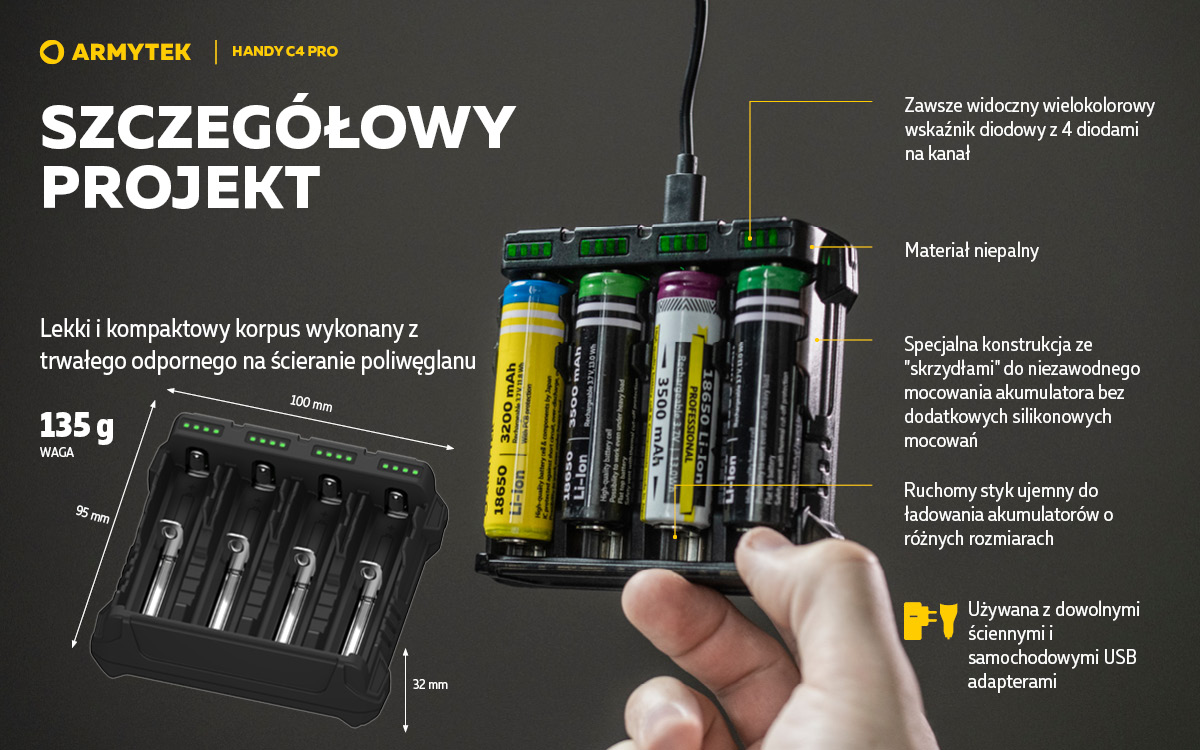 Handy C4 Pro to przenośna ładowarka do 4 baterii. Funkcja powerbanku pozwala na ładowanie dwóch gadżetów w tym samym czasie prądem do 2.5A, ładowarka jest kompatybilna z iPhonem i iPadem. Inteligentny system sterowania pobiera energię z dowolnej liczby kanałów, zapewniając maksymalną wydajność. Korpus urządzenia wykonany jest z materiału niepalnego. Kabel USB typu C w zestawie.
