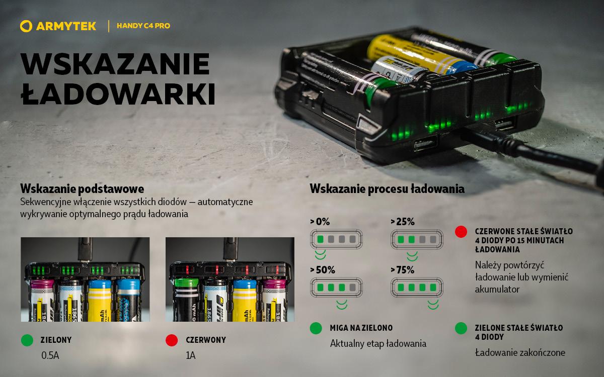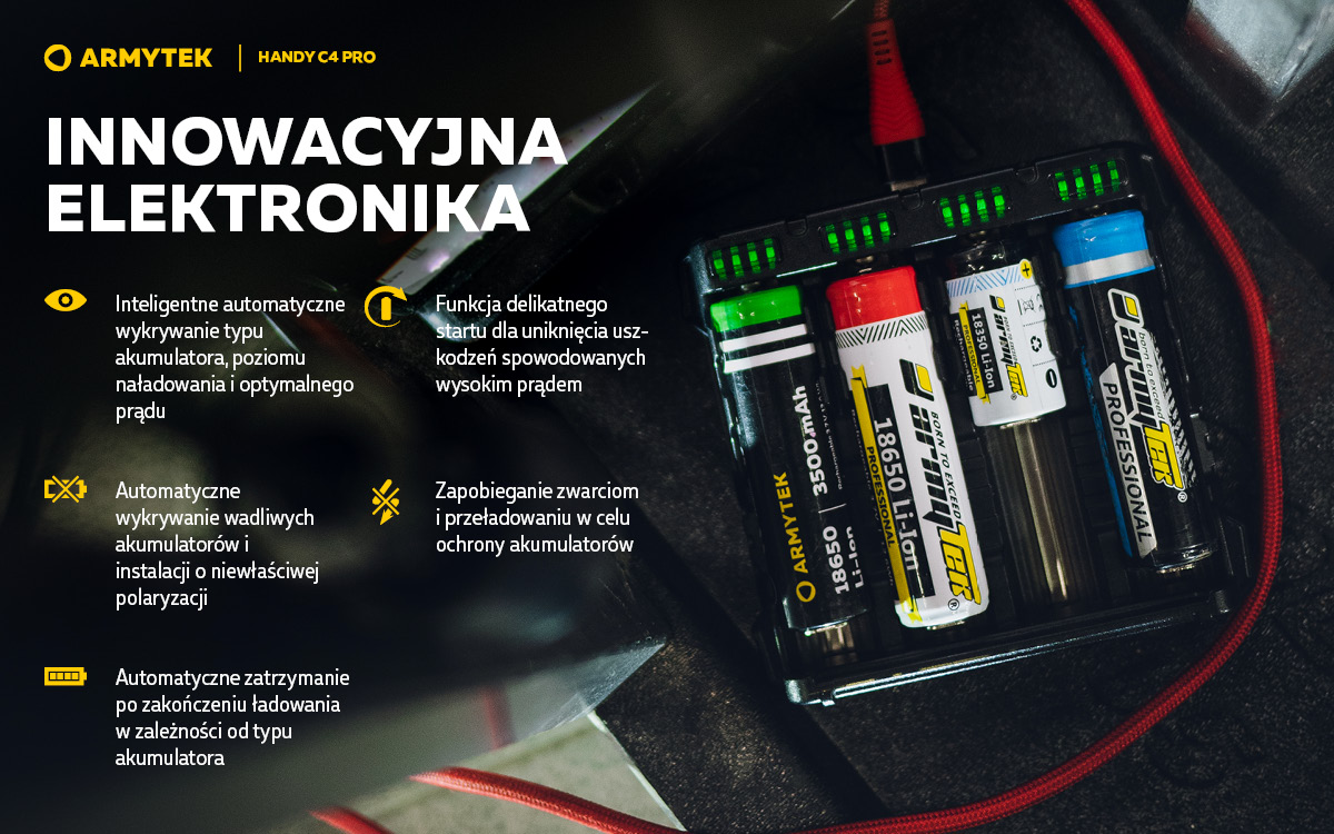 - Automatyczne wykrywanie niepasujących baterii i rozmieszczenia w niewłaściwej polaryzacji.
