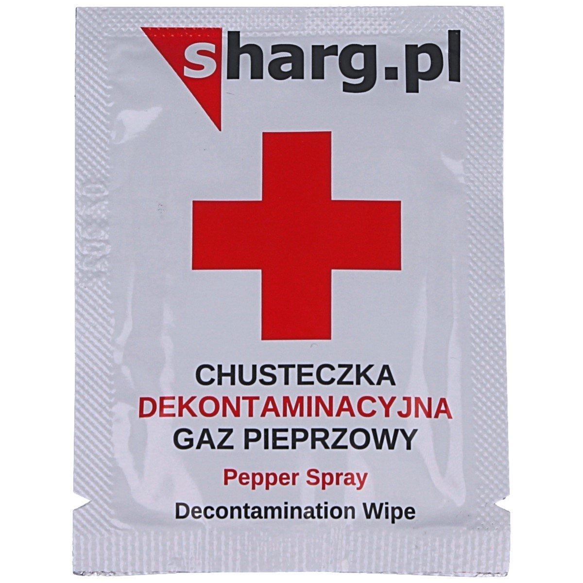 Chusteczka dekontaminacyjna Sharg, neutralizuje działanie gazów biologicznych pieprzowych OC oraz chemicznych CS, CN oraz innych substancji drażniących. Łagodzi skutki kontaktu z substancjami obezwładniającymi, podczas niespodziewanego ataku. Neutralizuje uczucie pieczenia oraz przywraca zdolność widzenia po podrażnieniu gazem łzawiącym. Zastosowanie chusteczki przynosi natychmiastową ulgę, najlepsze działanie daje zastosowanie dwóch chusteczek. Niewielki rozmiar 7x9 cm ułatwia przenoszenie, mieści się w każdej torebce, kieszeni spodni czy koszuli.