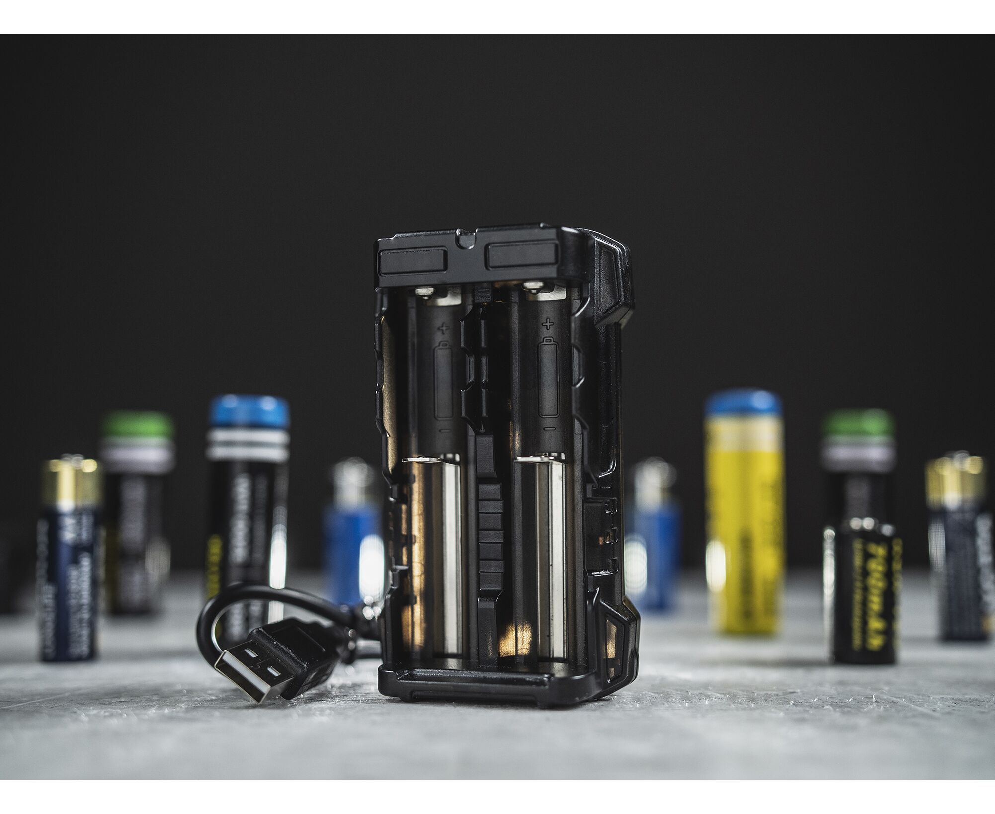 Obsługa akumulatorów IMR / Li-Ion, Ni-MH, Ni-Cd o średnicy 8…19 mm i długości 30…70 mm, na przykład: AA, AAA, AAAA, 10440, 14500, 16340, 18350, 18650, 18700. Szybkie ładowanie z prądem 1A i automatycznym wykrywaniem prądu 0,5A dla małych akumulatorów. Wbudowany Powerbank obsługuje urządzenia z prądem ładowania do 2,5A. Powerbank jest kompatybilny z iPhone’em i iPadem. 5 lat bezwarunkowej gwarancji.
