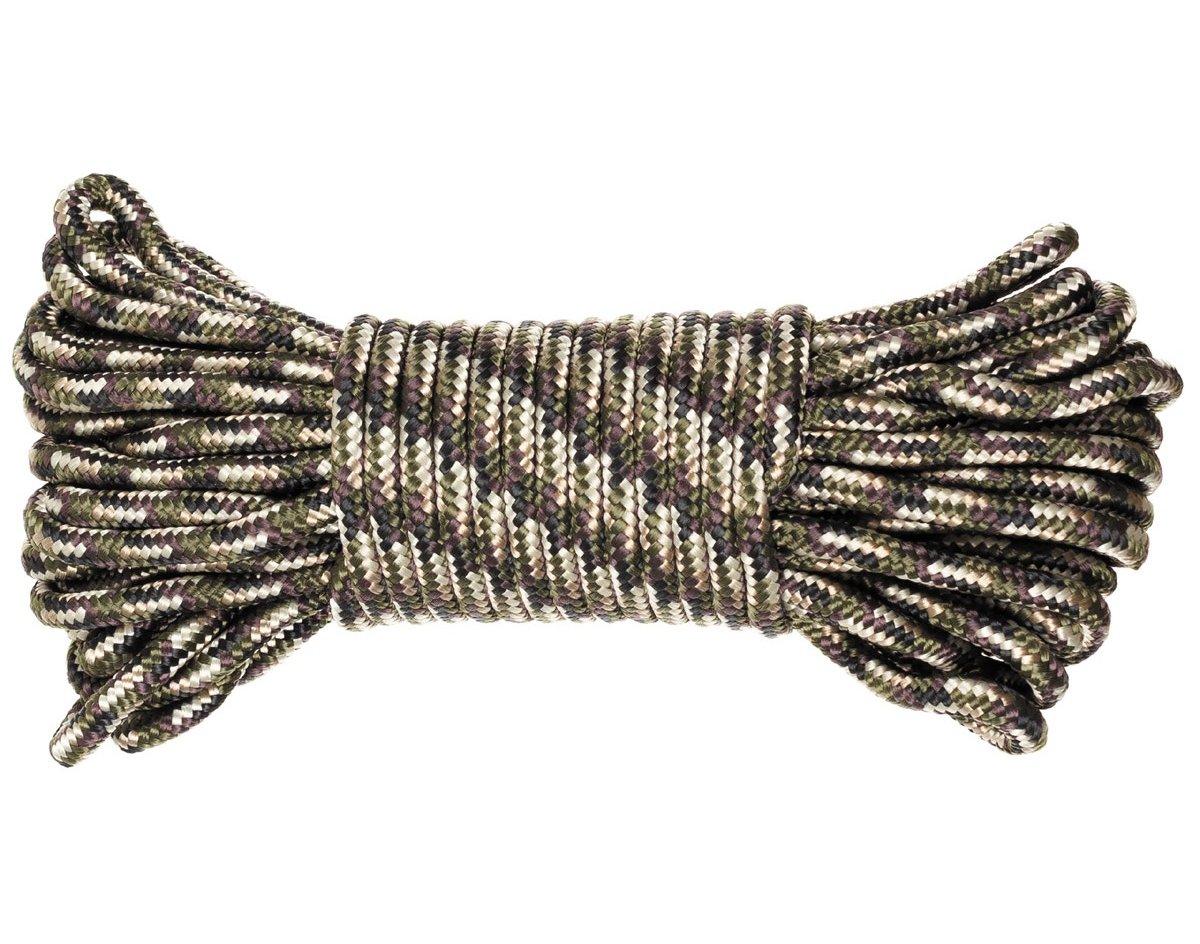 Bardzo mocna lina o długości 15 m i grubości 5 mm w kolorze kamuflażowym. Lina może być używana do mocowania namiotu, namiotu lub jako sznur do bielizny.