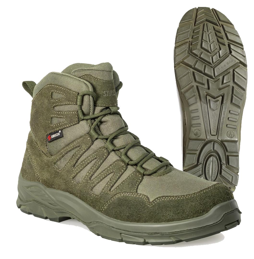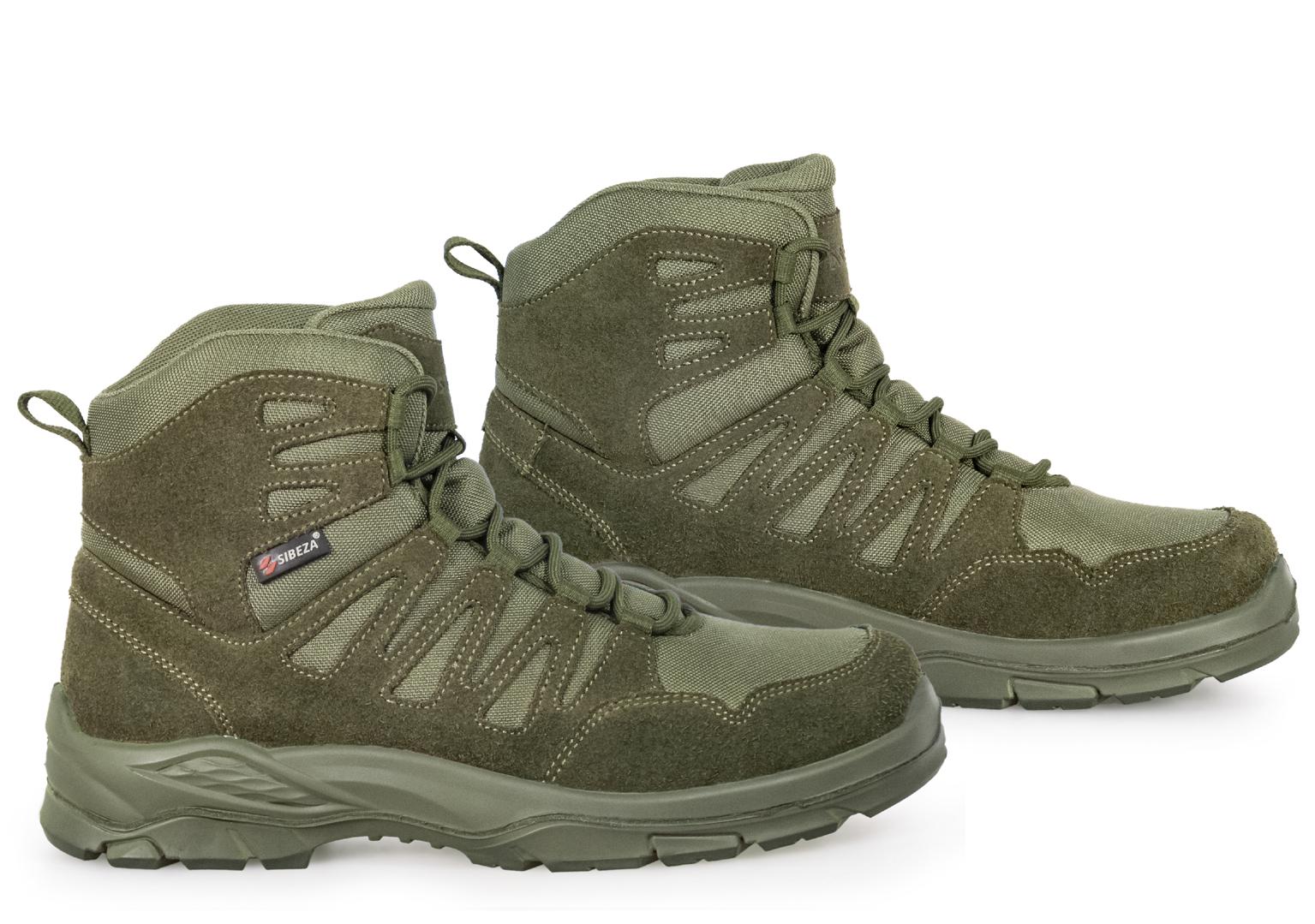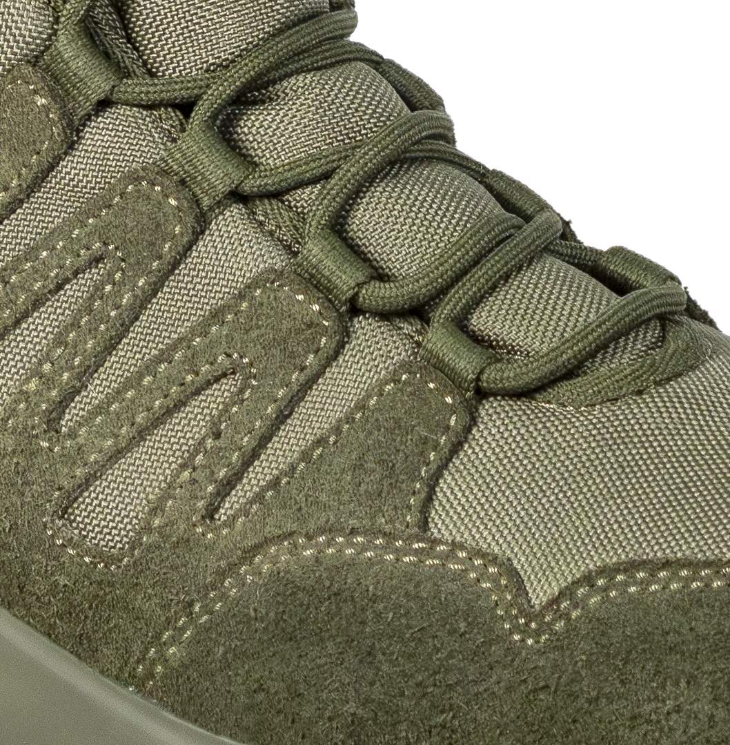 CHOLEWKA: naturalna, wodoodporna skóra bydlęca welurowa OLIWKA, połączona z impregnowaną, wysoce odporną na uszkodzenia tkaniną techniczną; pętelkowy system mocowania składający się z wytrzymałych, niemetalowych uchwytów pętelkowych; Przepuszczalność i absorpcja wody ograniczona przez WRU;