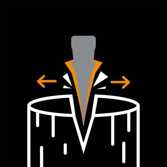 • Ostrze o nowej ulepszonej konstrukcji: szersze i z klinem dzielącym, mocniejsze uderzenia i łatwiejsze usuwanie ostrza z drewna