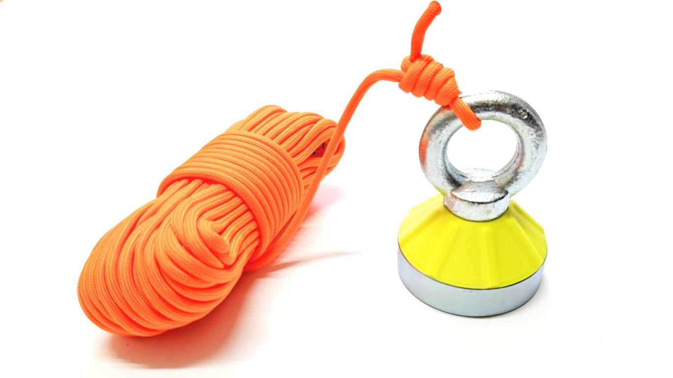 Zestaw do połowu magnesem zawiera: magnes z oczkiem M198, linkę spadochronową 15m pomarańczową i stożek ochronny